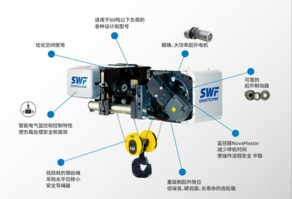 NOVA Silverline是SWF鋼絲繩葫蘆的旗艦產(chǎn)品。此系列產(chǎn)品優(yōu)化使用空間、操作高效、性價比高。NOVA silverline選項多、擴展性強、能適合各種工業(yè)應(yīng)用??筛鶕?jù)不同客戶的需求,配置其功能。